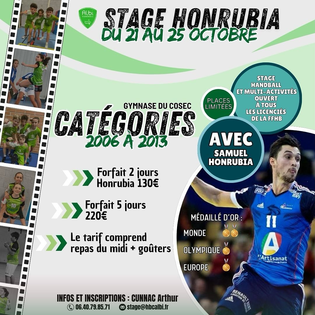Pour la première fois cette année, les deux premiers jours (lundi et mardi) du stage seront assurés par un ancien international français, Samuel HONRUBIA (champion olympique, champion d’Europe et double champion du monde). Ces deux jours seront destinés à une pratique de handball intensive. Le stage s’adresse aux catégories -13 à seniors première année.