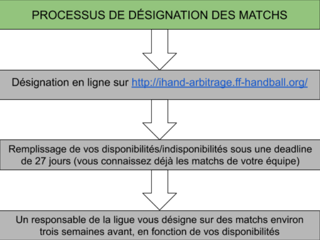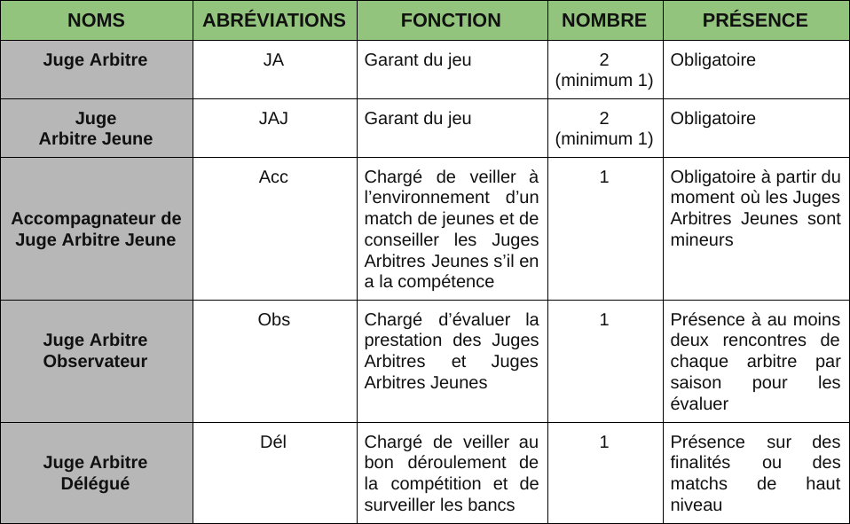 Les Juges Arbitres officient sur des rencontres adultes. Les Juges Arbitres Jeunes (-21 ans) officient sur des rencontres de jeunes. Chaque officiel présent est désigné sur la rencontre en fonction de son grade (excepté les Accompagnateurs de Juges Arbitres Jeunes, à charge des clubs recevants).